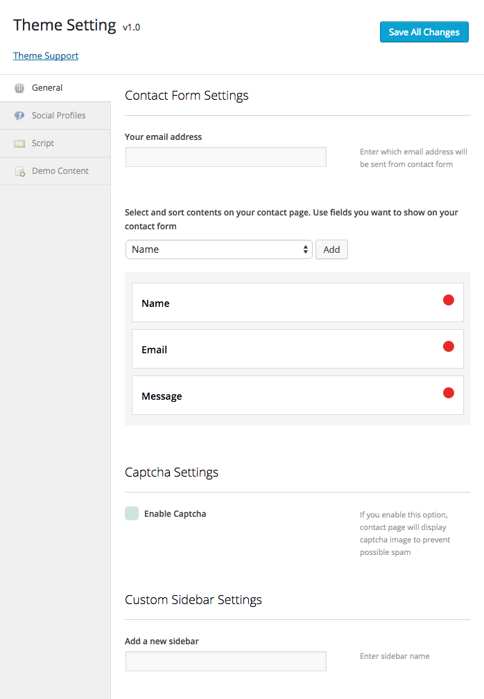 Theme Setting > General for contact form settings captcha and custom sidebar