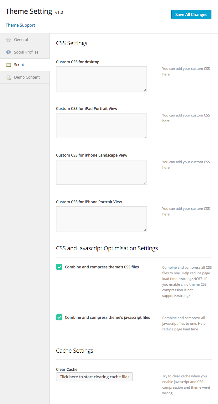 Theme Setting > Script for custom CSS and script compression features
